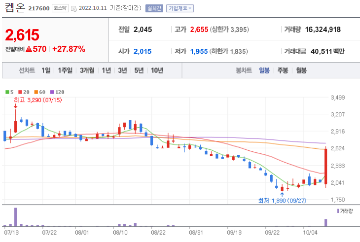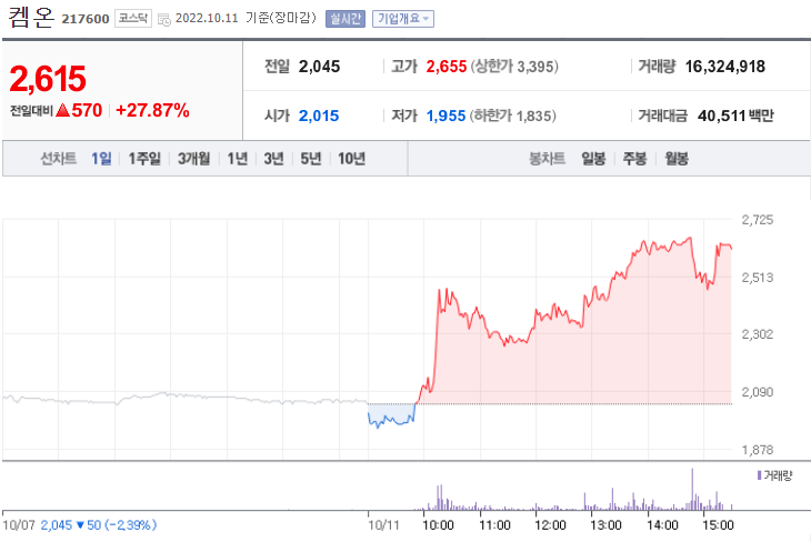 코아스템과 켐온이 서로 상한가를 갔습니다.