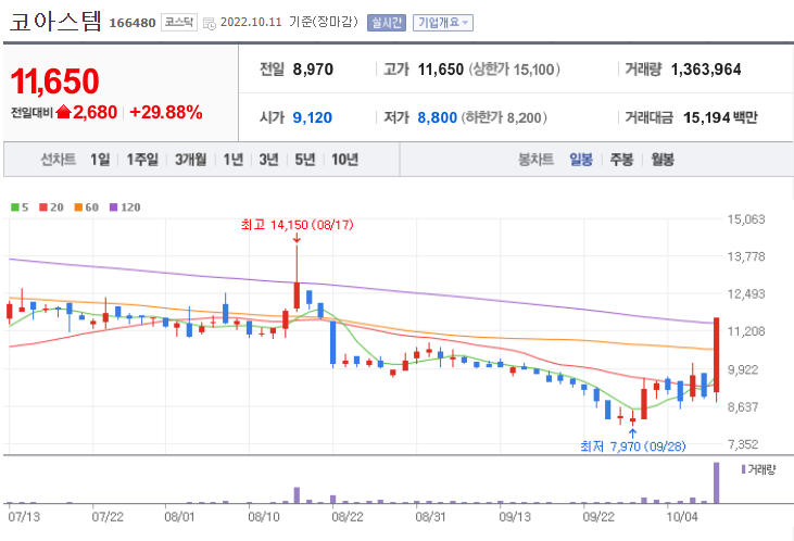 코아스템은 켐온 흡수합병 소식에, 켐온도 코아스템 흡수합병 소식에 상한가를 갔습니다.